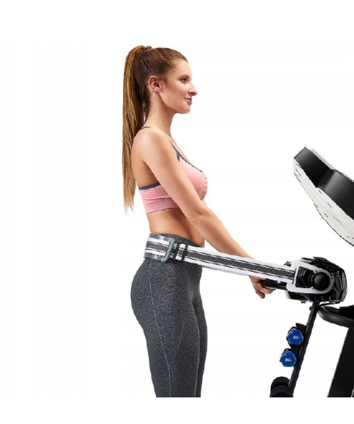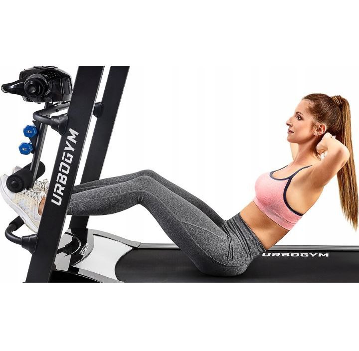 Bieżnia posiada specjalną konstrukcję, która służy jako przyrząd do ćwiczeń mięśni brzucha. Wygodne uchwyty pomagają w wykonywaniu tego rodzaju ćwiczeń. Dodatkowo wygospodarowano na nich miejsce do odłożenia hantli załączonych do zestawu.